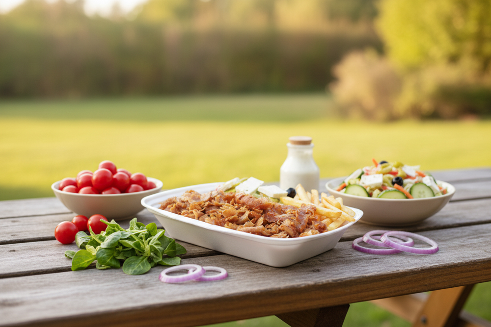 Drehfleisch mit Pommes, Salat, Zaziki oder Salatsoße & Brot
