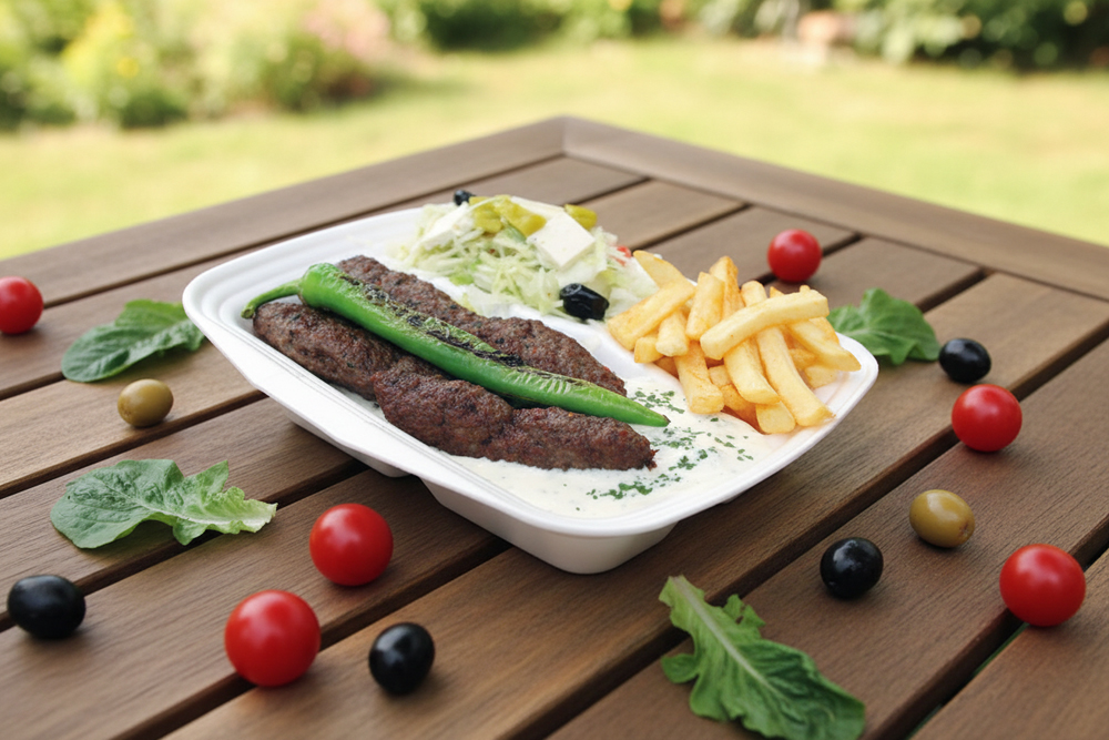 Drehfleisch & Köfte mit Pommes, gebratenen Zwiebeln, gemischtem Salat, Zaziki oder Salatsoße & Brot