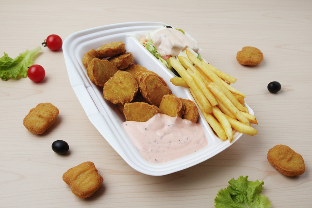 12 panierte Chicken Nuggets, mit Pommes, gemischtem Salat, Zaziki oder Salatsoße & Brot