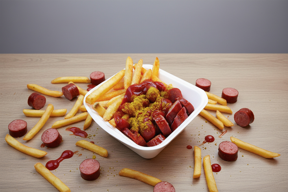 Rindswurst mit Pommes, Ketchup, Mayonaise oder Senf