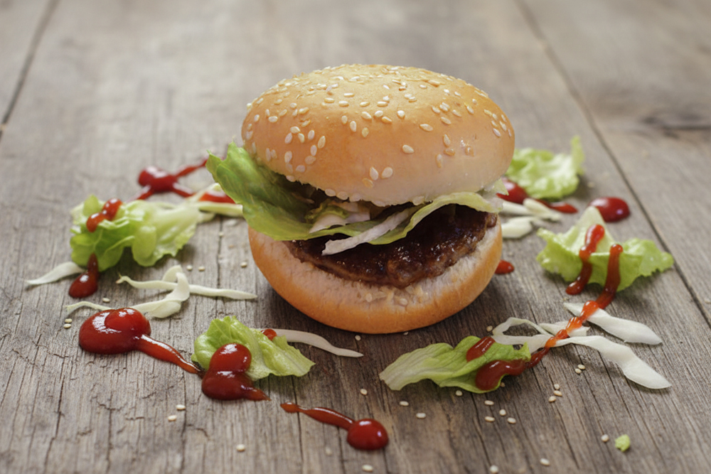 Rindfleisch-patty in Burgerbrötchen mit Salat und Ketchup