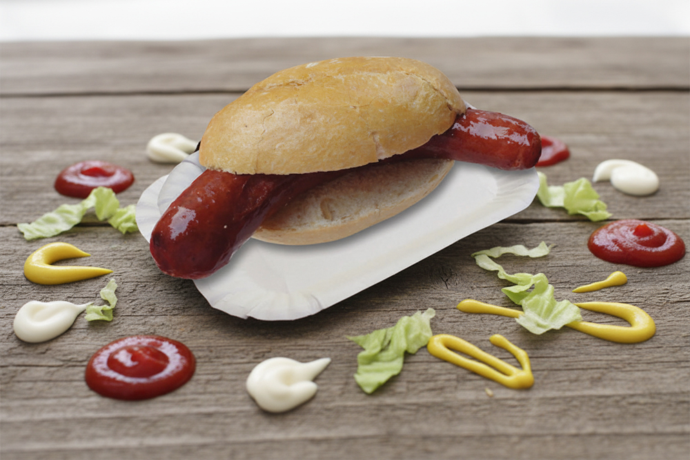 Rindswurst in Brötchen, Ketchup, Mayonaise oder Senf