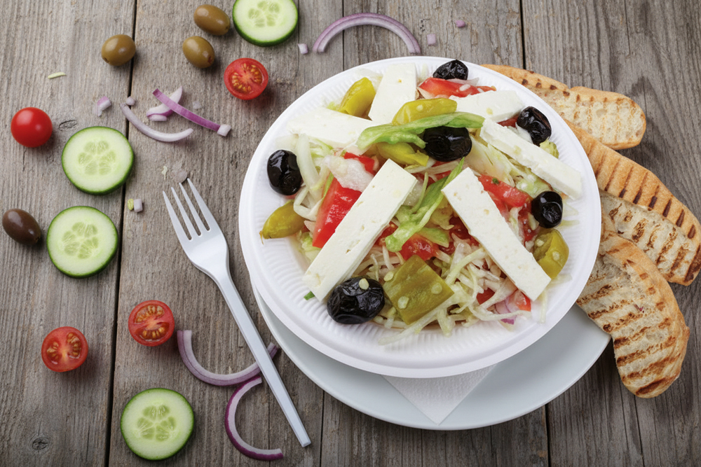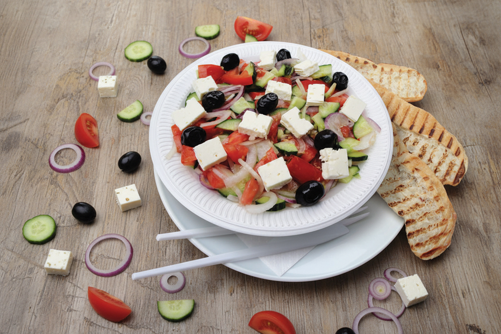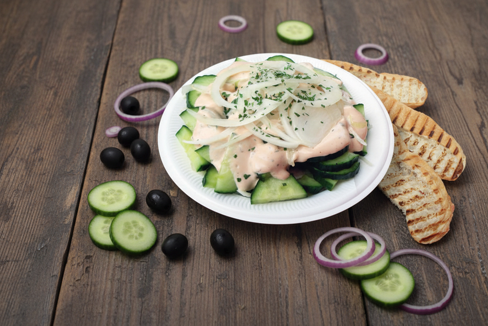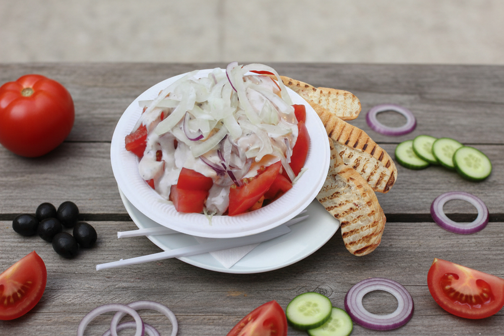 mit Eisbergsalat, Weißkraut, Tomaten, Gurken, Zwiebeln, Weichkäse, Oliven, Peperoni Salatsoße und Brot
