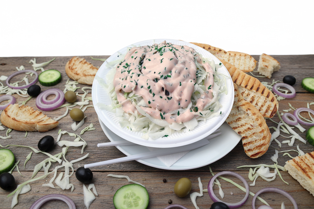 mit Eisbergsalat, Weißkraut, Gurken, Zwiebeln, Salatsoße und Brot