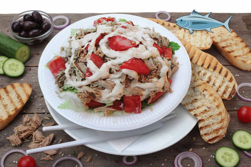 mit Eisbergsalat, Thunfisch, Tomaten, Zwiebeln, Salatsoße und Brot