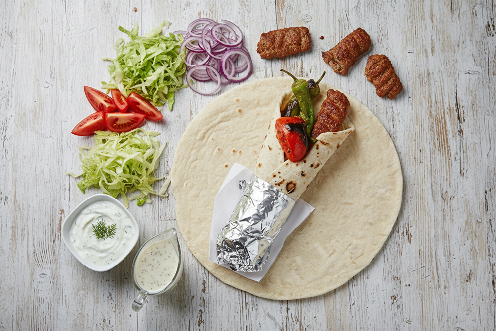 Dürümrolle mit Weichkäse, Salat, Tomaten, Zwiebeln, Zaziki oder Salatsoße