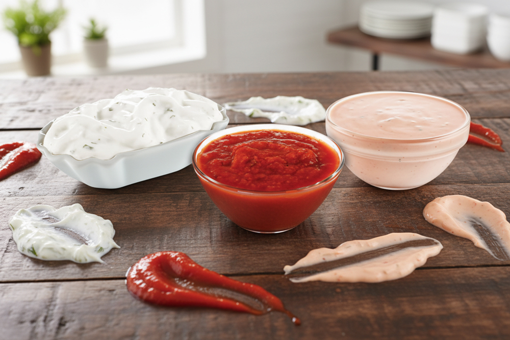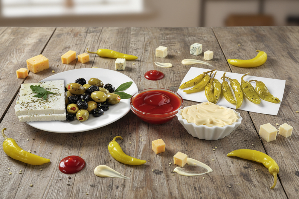 (a) zaziki (b) salatsoße (c) Chili Soße (d) Ketchup (e) Majo (f) Senf